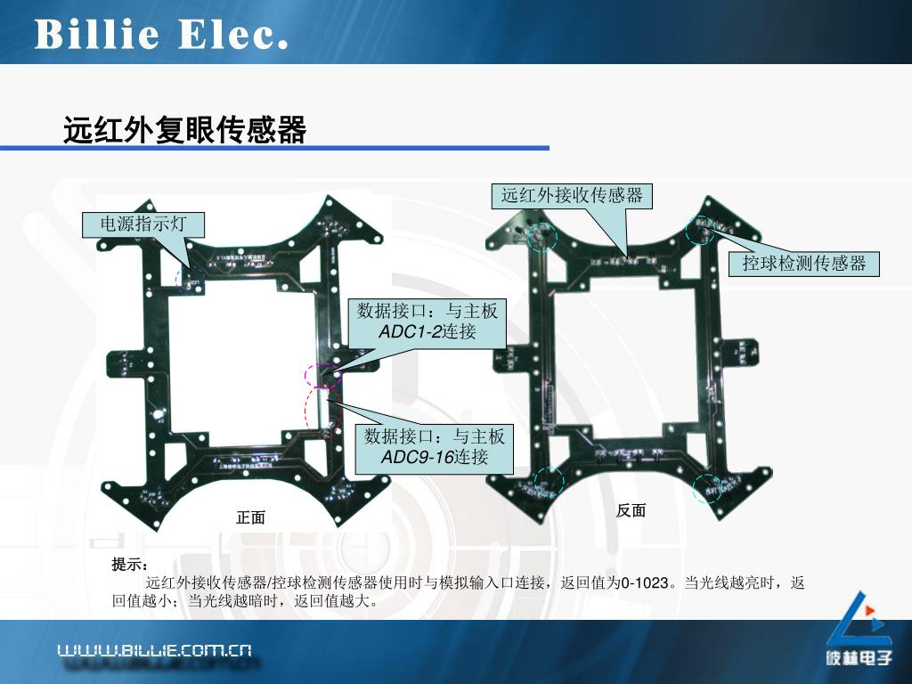 远红外复眼传感器 远红外接收传感器 电源指示灯 控球检测传感器 数据接口:与主板ADC1-2连接 数据接口:与主板ADC9-16连接 反面 正面 提示: 远红外接收传感器/控球检测传感器使用时与模拟输入口连接,返回值为0-1023。当光线越亮时,返回值越小;当光线越暗时,返回值越大。