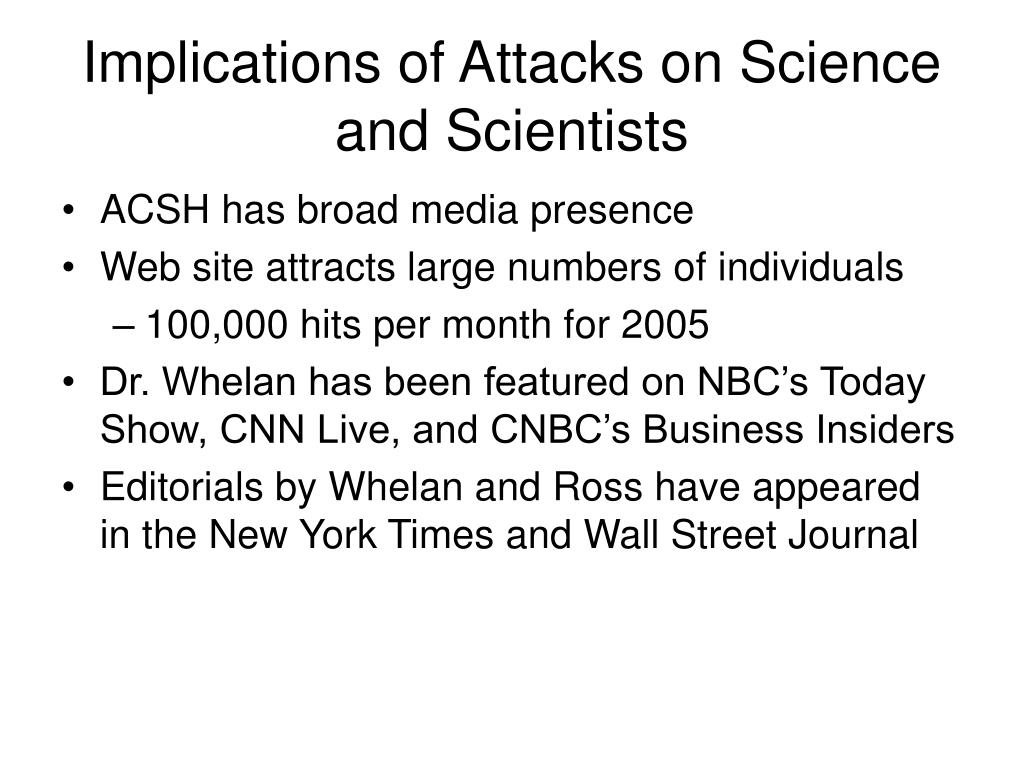Implications of Attacks on Science and Scientists • ACSH has broad media presence • Web site attracts large numbers of individuals • 100,000 hits per month for 2005 • Dr. Whelan has been featured on NBC’s Today Show, CNN Live, and CNBC’s Business Insiders • Editorials by Whelan and Ross have appeared in the New York Times and Wall Street Journal