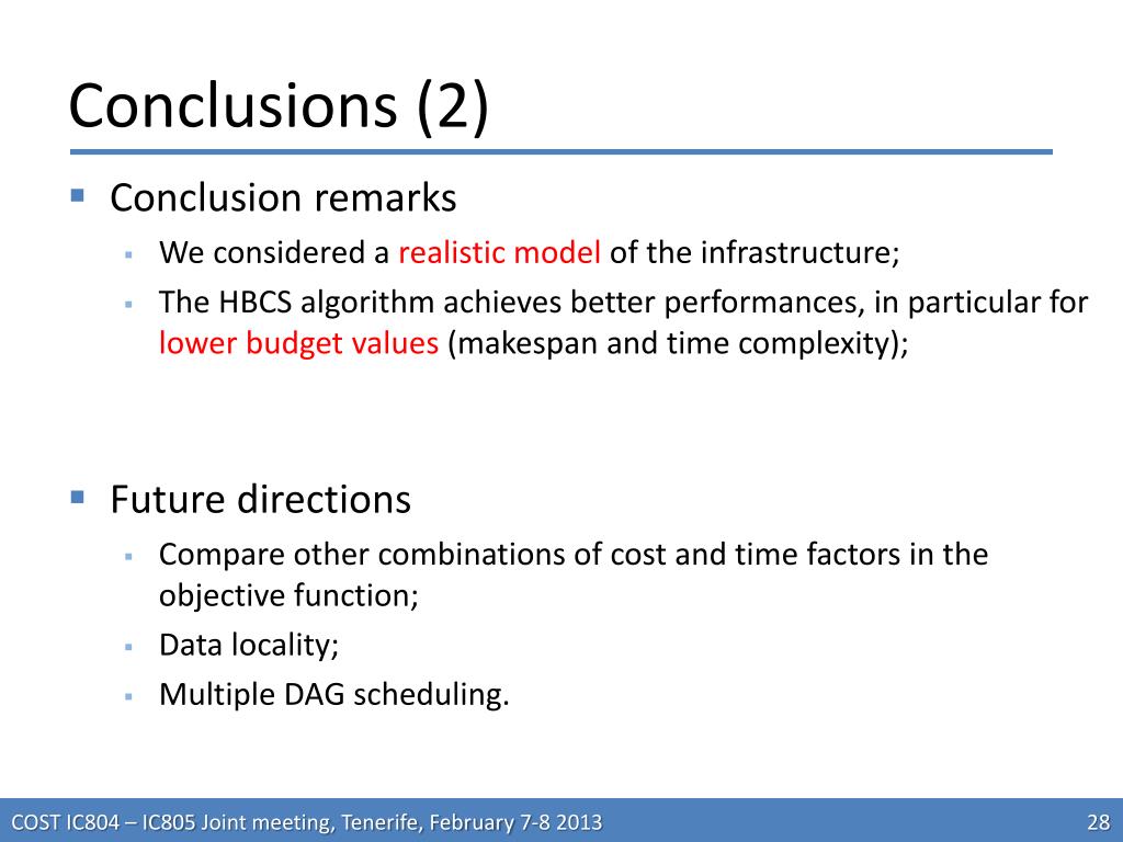 Conclusions (2) • Conclusion remarks • We considered a realistic model of the infrastructure; • The HBCS algorithm achieves better performances, in particular for lower budget values (makespan and time complexity); • Future directions • Compare other combinations of cost and time factors in the objective function; • Data locality; • Multiple DAG scheduling. COST IC804 – IC805 Joint meeting, Tenerife, February 7-8 2013