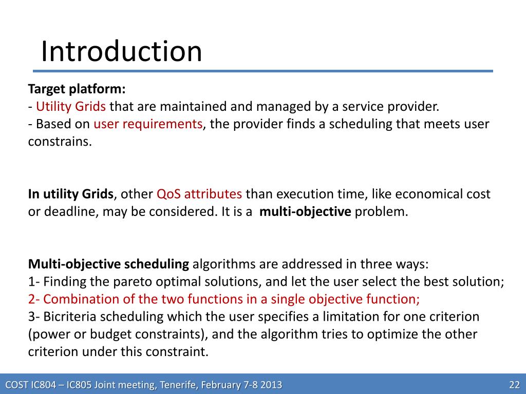 Introduction Target platform: - Utility Grids that are maintained and managed by a service provider. - Based on user requirements, the provider finds a scheduling that meets user constrains. In utility Grids, other QoS attributes than execution time, like economical cost or deadline, may be considered. It is a multi-objectiveproblem. Multi-objective scheduling algorithms are addressed in three ways: 1- Finding the pareto optimal solutions, and let the user select the best solution; 2- Combination of the two functions in a single objective function; 3- Bicriteria scheduling which the user specifies a limitation for one criterion (power or budget constraints), and the algorithm tries to optimize the other criterion under this constraint. COST IC804 – IC805 Joint meeting, Tenerife, February 7-8 2013