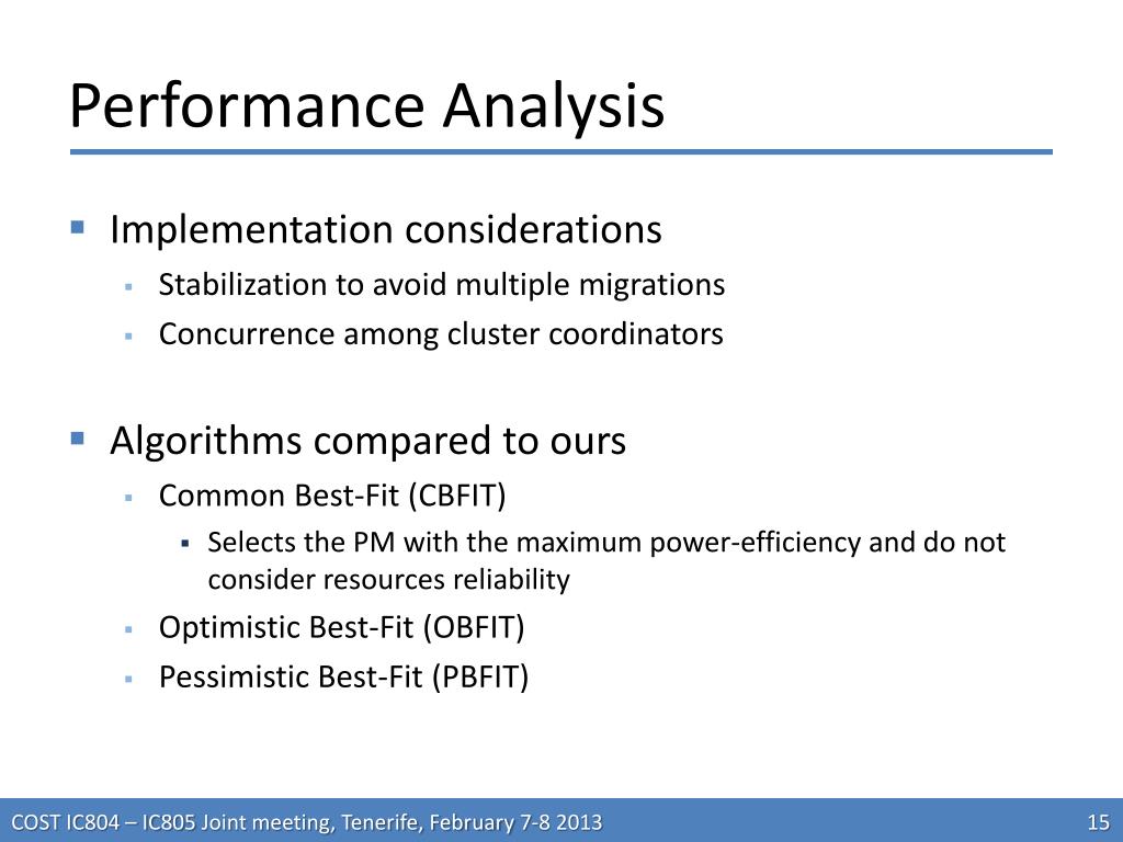 Performance Analysis • Implementation considerations • Stabilization to avoid multiple migrations • Concurrence among cluster coordinators • Algorithms compared to ours • Common Best-Fit (CBFIT) • Selects the PM with the maximum power-efficiency and do not consider resources reliability • Optimistic Best-Fit (OBFIT) • Pessimistic Best-Fit (PBFIT) COST IC804 – IC805 Joint meeting, Tenerife, February 7-8 2013