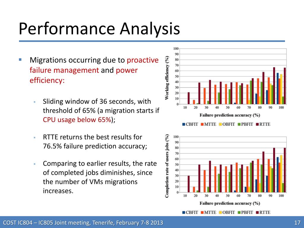 Performance Analysis • Migrations occurring due to proactive failure management and power efficiency: • Sliding window of 36 seconds, with threshold of 65% (a migration starts if CPU usage below 65%); • RTTE returns the best results for 76.5% failure prediction accuracy; • Comparing to earlier results, the rate of completed jobs diminishes, since the number of VMs migrations increases. COST IC804 – IC805 Joint meeting, Tenerife, February 7-8 2013