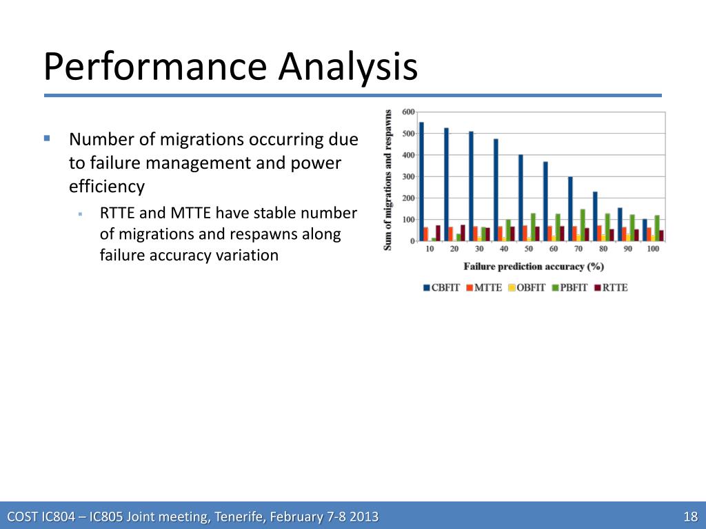 Performance Analysis • Number of migrations occurring due to failure management and power efficiency • RTTE and MTTE have stable number of migrations and respawns along failure accuracy variation • Migrations occurring due to proactive failure management only (75% accuracy) • RTTE and MTTE return the best working efficiency as the number of failures in the cloud infrastructure rises COST IC804 – IC805 Joint meeting, Tenerife, February 7-8 2013