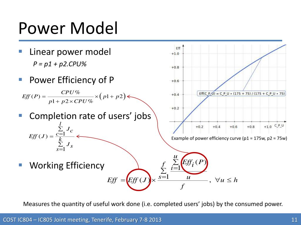 Power Model • Linear power model P = p1 + p2.CPU% • Power Efficiency of P • Completion rate of users’ jobs • Working Efficiency • Example of power efficiency curve (p1 = 175w, p2 = 75w) Measures the quantity of useful work done (i.e. completed users’ jobs) by the consumed power. COST IC804 – IC805 Joint meeting, Tenerife, February 7-8 2013