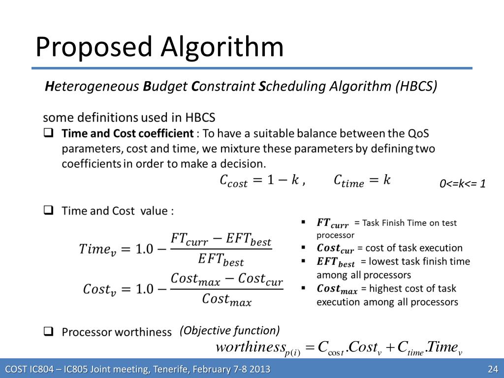 Proposed Algorithm Heterogeneous Budget Constraint Scheduling Algorithm (HBCS) 0<=k<= 1 (Objective function) COST IC804 – IC805 Joint meeting, Tenerife, February 7-8 2013