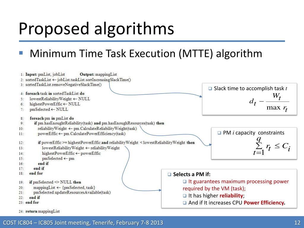 Proposed algorithms • Minimum Time Task Execution (MTTE) algorithm • Slack time to accomplish task t • PM icapacity constraints • Selects a PM if: • It guarantees maximum processing power required by the VM (task); • It has higher reliability; • And if It increases CPU Power Efficiency. COST IC804 – IC805 Joint meeting, Tenerife, February 7-8 2013