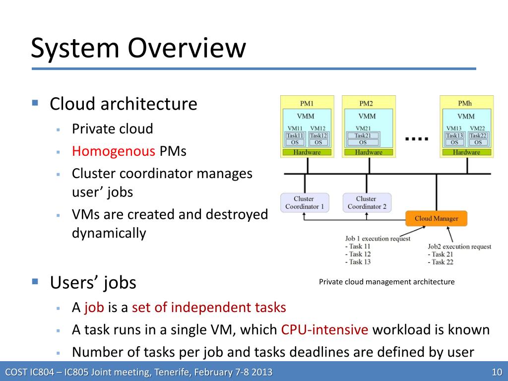System Overview • Cloud architecture • Private cloud • Homogenous PMs • Cluster coordinator manages user’ jobs • VMs are created and destroyed dynamically • Users’ jobs • A job is a set of independent tasks • A task runs in a single VM, which CPU-intensive workload is known • Number of tasks per joband tasks deadlines are defined by user • Private cloud management architecture COST IC804 – IC805 Joint meeting, Tenerife, February 7-8 2013