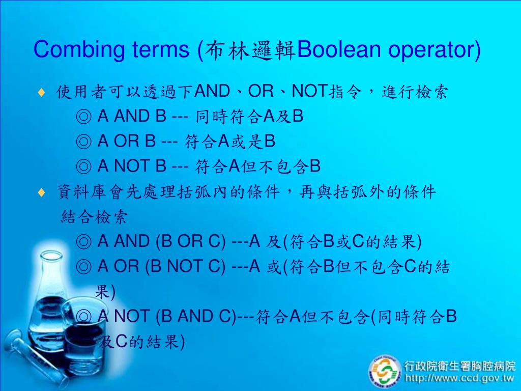 Combing terms (布林邏輯Boolean operator) • 使用者可以透過下AND、OR、NOT指令,進行檢索 ◎ A AND B --- 同時符合A及B ◎ A OR B --- 符合A或是B ◎ A NOT B --- 符合A但不包含B • 資料庫會先處理括弧內的條件,再與括弧外的條件 結合檢索 ◎ A AND (B OR C) ---A 及(符合B或C的結果) ◎ A OR (B NOT C) ---A 或(符合B但不包含C的結 果) ◎ A NOT (B AND C)---符合A但不包含(同時符合B 及C的結果)