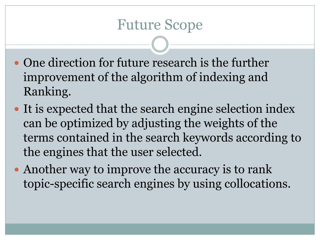 Future Scope One direction for future research is the further improvement of the algorithm of indexing and Ranking. It is expected that the search engine selection index can be optimized by adjusting the weights of the terms contained in the search keywords according to the engines that the user selected. Another way to improve the accuracy is to rank topic-specific search engines by using collocations.