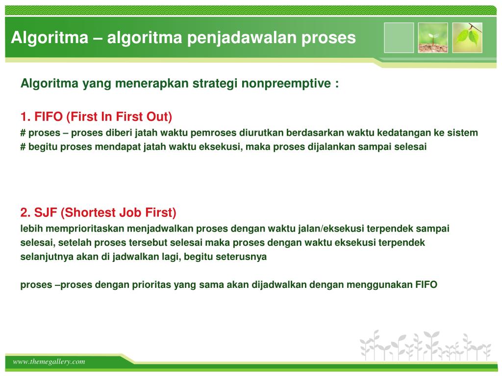 Algoritma – algoritmapenjadawalan proses Algoritma yang menerapkanstrateginonpreemptive : 1. FIFO (First In First Out) # proses – proses diberijatahwaktupemrosesdiurutkanberdasarkanwaktukedatangankesistem # begitu proses mendapatjatahwaktueksekusi, maka proses dijalankansampaiselesai 2. SJF (Shortest Job First) lebihmemprioritaskanmenjadwalkan proses denganwaktujalan/eksekusiterpendeksampaiselesai, setelah proses tersebutselesaimaka proses denganwaktueksekusiterpendekselanjutnyaakan di jadwalkanlagi, begituseterusnya proses –proses denganprioritas yang samaakandijadwalkandenganmenggunakan FIFO
