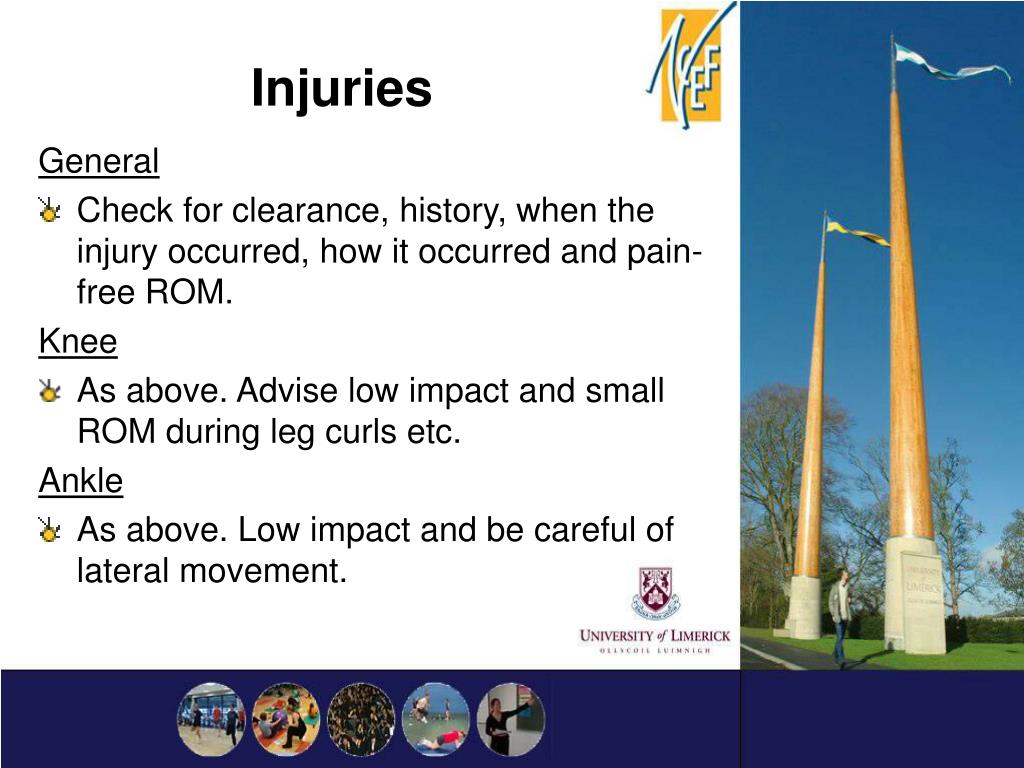 Injuries General • Check for clearance, history, when the injury occurred, how it occurred and pain-free ROM. Knee • As above. Advise low impact and small ROM during leg curls etc. Ankle • As above. Low impact and be careful of lateral movement.