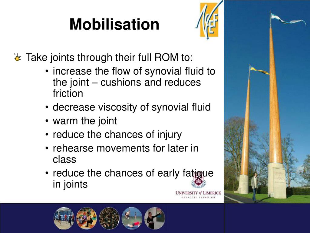 Mobilisation • Take joints through their full ROM to: • increase the flow of synovial fluid to the joint – cushions and reduces friction • decrease viscosity of synovial fluid • warm the joint • reduce the chances of injury • rehearse movements for later in class • reduce the chances of early fatigue in joints