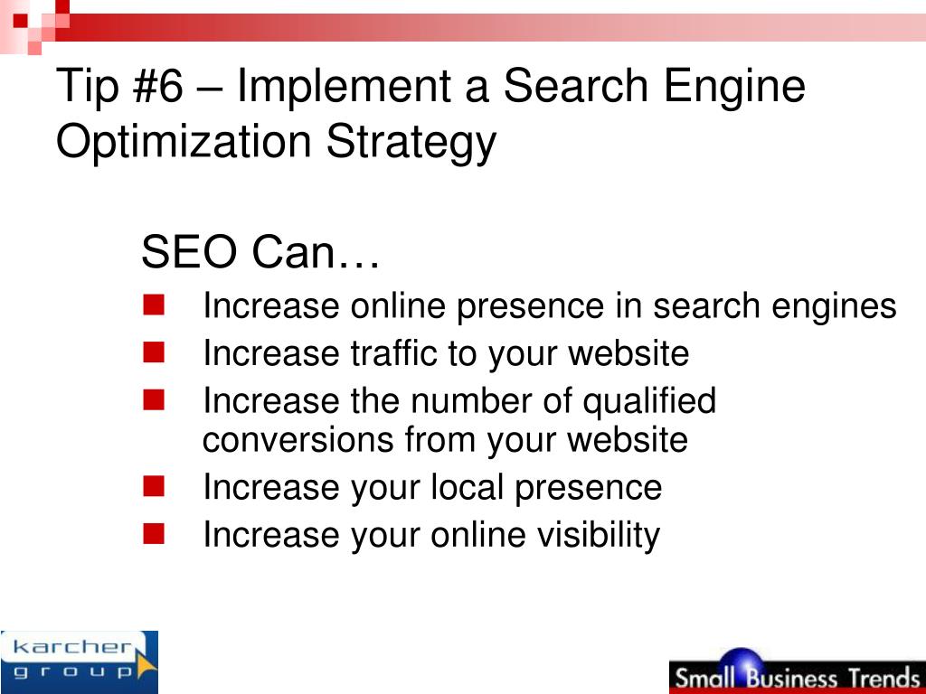 Tip #6 – Implement a Search Engine Optimization Strategy SEO Can… • Increase online presence in search engines • Increase traffic to your website • Increase the number of qualified conversions from your website • Increase your local presence • Increase your online visibility