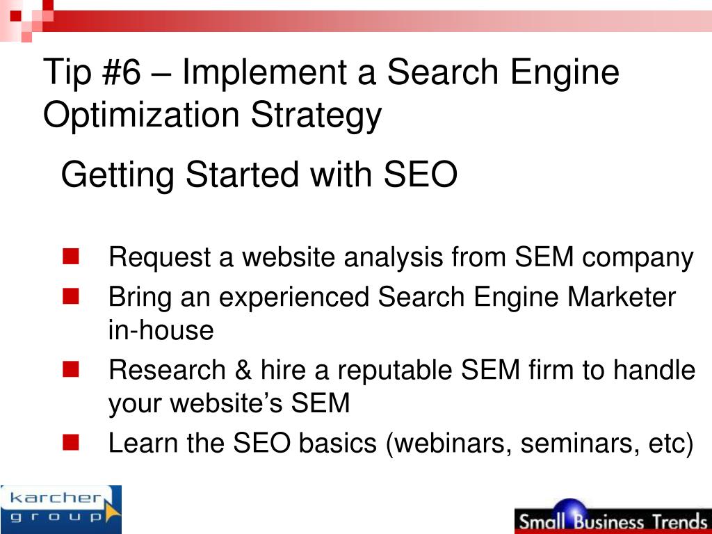 Tip #6 – Implement a Search Engine Optimization Strategy Getting Started with SEO • Request a website analysis from SEM company • Bring an experienced Search Engine Marketer in-house • Research & hire a reputable SEM firm to handle your website’s SEM • Learn the SEO basics (webinars, seminars, etc)