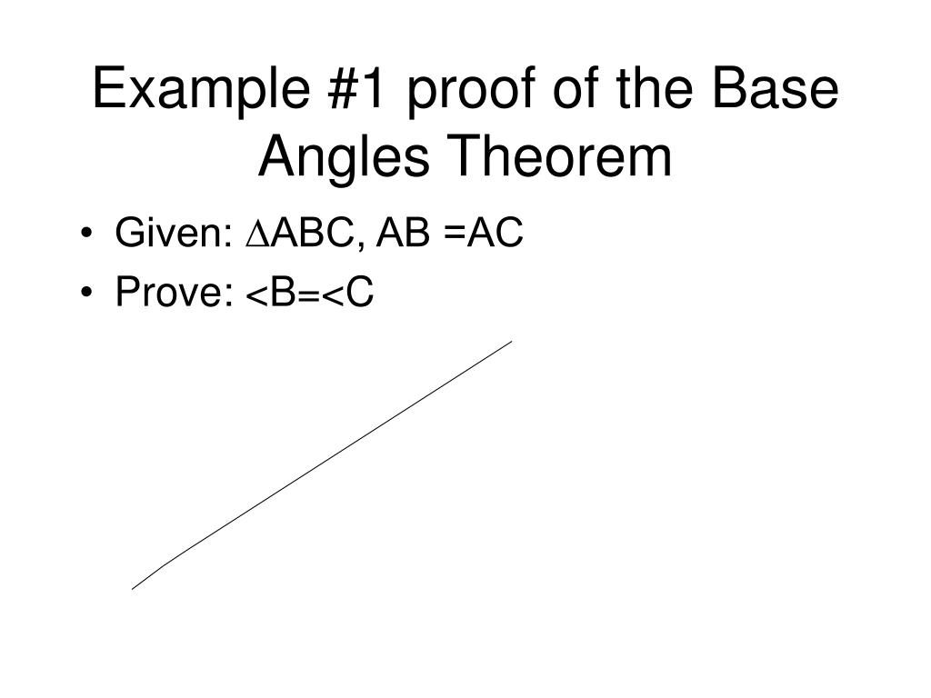 Example #1 proof of the Base Angles Theorem • Given: ∆ABC, AB =AC • Prove: <B=<C