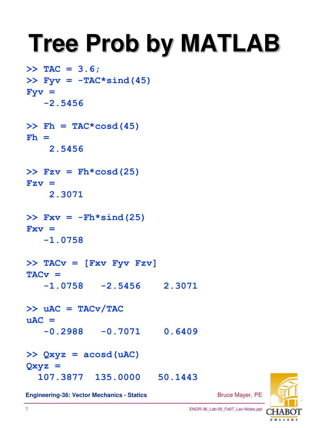 Tree Prob by MATLAB >> TAC = 3.6; >> Fyv = -TAC*sind(45) Fyv= -2.5456 >> Fh = TAC*cosd(45) Fh= 2.5456 >> Fzv = Fh*cosd(25) Fzv= 2.3071 >> Fxv = -Fh*sind(25) Fxv= -1.0758 >> TACv = [FxvFyvFzv] TACv= -1.0758 -2.5456 2.3071 >> uAC = TACv/TAC uAC= -0.2988 -0.7071 0.6409 >> Qxyz = acosd(uAC) Qxyz= 107.3877 135.0000 50.1443