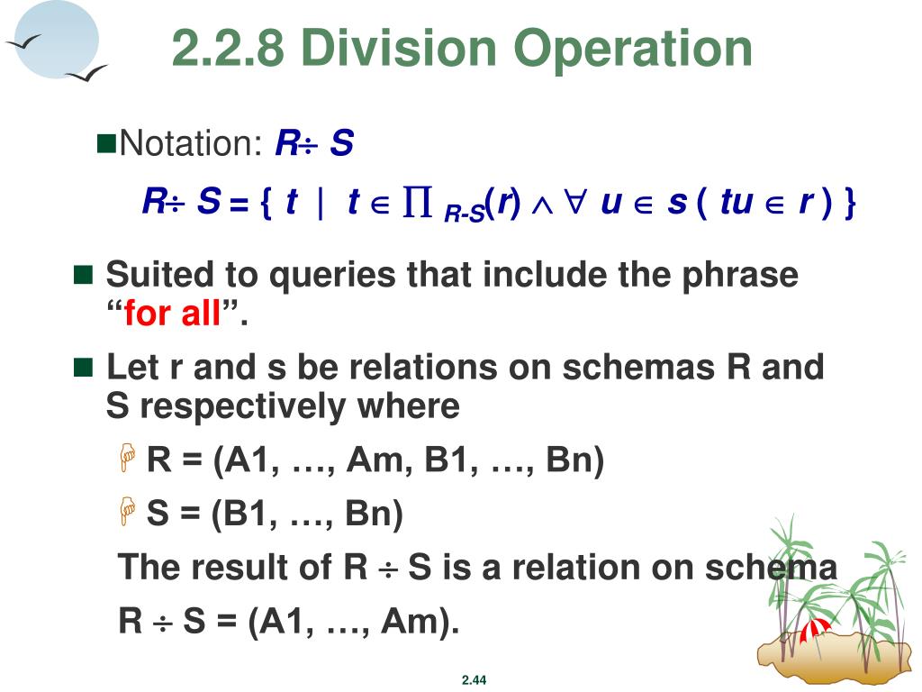 2.2.8 Division Operation • Suited to queries that include the phrase “for all”. • Let r and s be relations on schemas R and S respectively where • R = (A1, …, Am, B1, …, Bn) • S = (B1, …, Bn) The result of R S is a relation on schema R S = (A1, …, Am). • Notation: R S R S = { t | t R-S(r) u s ( tu r ) }