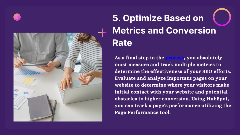 5. Optimize Based on Metrics and Conversion Rate As a final step in the process, you absolutely must measure and track multiple metrics to determine the effectiveness of your SEO efforts. Evaluate and analyze important pages on your website to determine where your visitors make initial contact with your website and potential obstacles to higher conversion. Using HubSpot, you can track a page's performance utilizing the Page Performance tool.