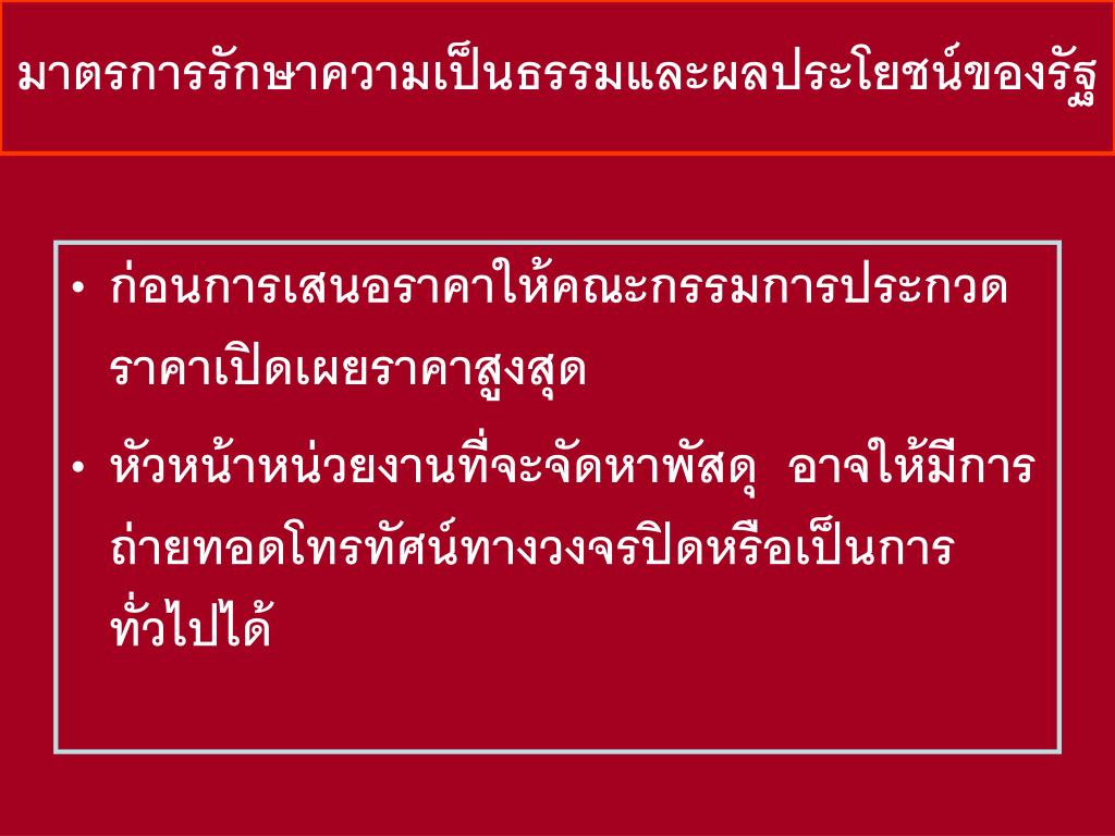 มาตรการรักษาความเป็นธรรมและผลประโยชน์ของรัฐมาตรการรักษาความเป็นธรรมและผลประโยชน์ของรัฐ • ก่อนการเสนอราคาให้คณะกรรมการประกวดราคาเปิดเผยราคาสูงสุด • หัวหน้าหน่วยงานที่จะจัดหาพัสดุ อาจให้มีการถ่ายทอดโทรทัศน์ทางวงจรปิดหรือเป็นการทั่วไปได้