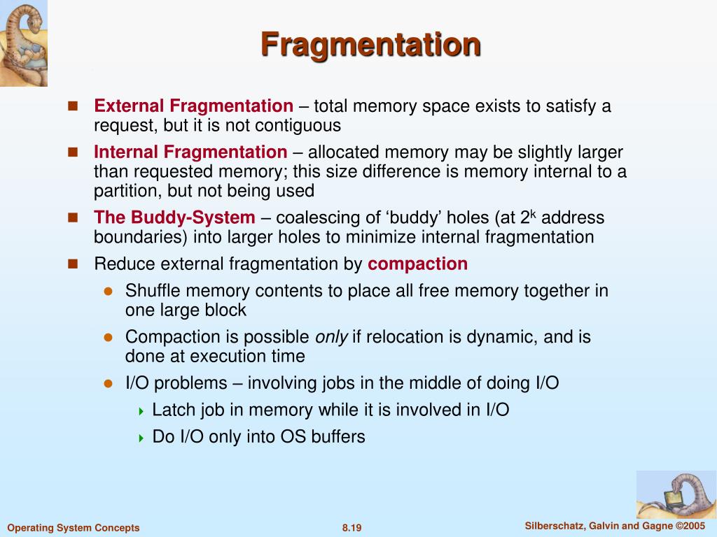 Fragmentation • External Fragmentation – total memory space exists to satisfy a request, but it is not contiguous • Internal Fragmentation – allocated memory may be slightly larger than requested memory; this size difference is memory internal to a partition, but not being used • The Buddy-System – coalescing of ‘buddy’ holes (at 2k address boundaries) into larger holes to minimize internal fragmentation • Reduce external fragmentation by compaction • Shuffle memory contents to place all free memory together in one large block • Compaction is possible only if relocation is dynamic, and is done at execution time • I/O problems – involving jobs in the middle of doing I/O • Latch job in memory while it is involved in I/O • Do I/O only into OS buffers