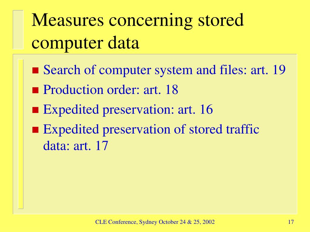 Measures concerning stored computer data • Search of computer system and files: art. 19 • Production order: art. 18 • Expedited preservation: art. 16 • Expedited preservation of stored traffic data: art. 17 CLE Conference, Sydney October 24 & 25, 2002