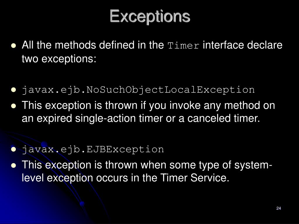 Exceptions • All the methods defined in the Timer interface declare two exceptions: • javax.ejb.NoSuchObjectLocalException • This exception is thrown if you invoke any method on an expired single-action timer or a canceled timer. • javax.ejb.EJBException • This exception is thrown when some type of system-level exception occurs in the Timer Service.