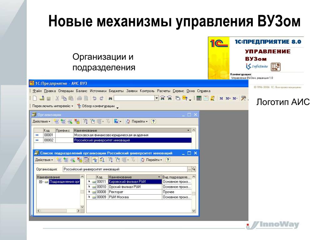 Новые механизмы управления ВУЗом Организации и подразделения Логотип АИС
