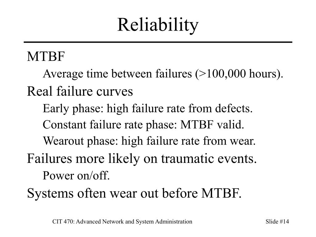 Reliability MTBF Average time between failures (>100,000 hours). Real failure curves Early phase: high failure rate from defects. Constant failure rate phase: MTBF valid. Wearout phase: high failure rate from wear. Failures more likely on traumatic events. Power on/off. Systems often wear out before MTBF. CIT 470: Advanced Network and System Administration