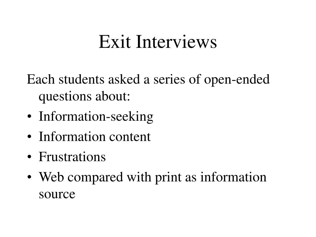 Exit Interviews Each students asked a series of open-ended questions about: • Information-seeking • Information content • Frustrations • Web compared with print as information source