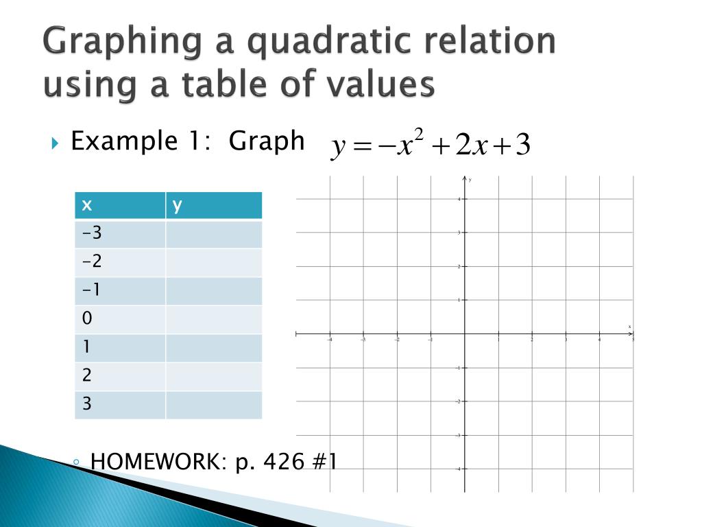 Graphing a quadratic relation using a table of values • Example 1: Graph • HOMEWORK: p. 426 #1