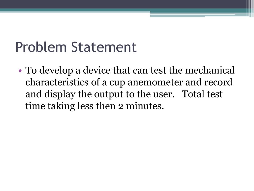 Problem Statement • To develop a device that can test the mechanical characteristics of a cup anemometer and record and display the output to the user. Total test time taking less then 2 minutes.