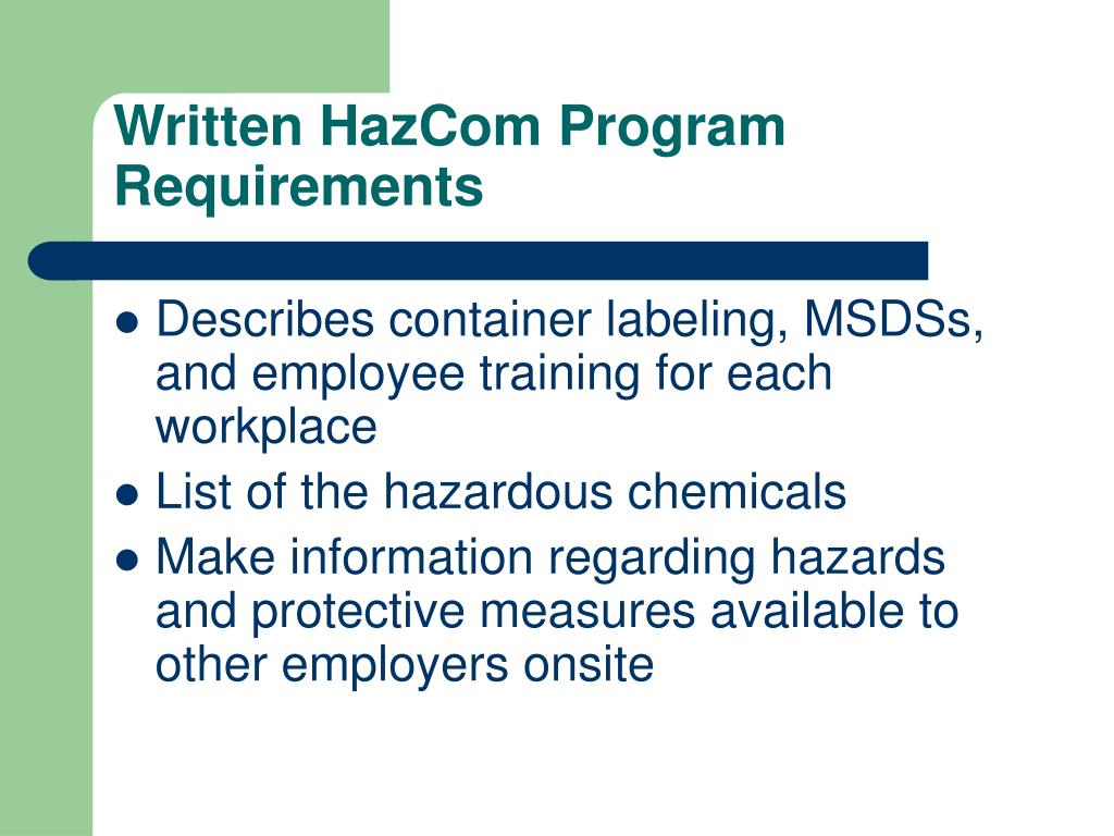 Written HazCom ProgramRequirements • Describes container labeling, MSDSs, and employee training for each workplace • List of the hazardous chemicals • Make information regarding hazards and protective measures available to other employers onsite
