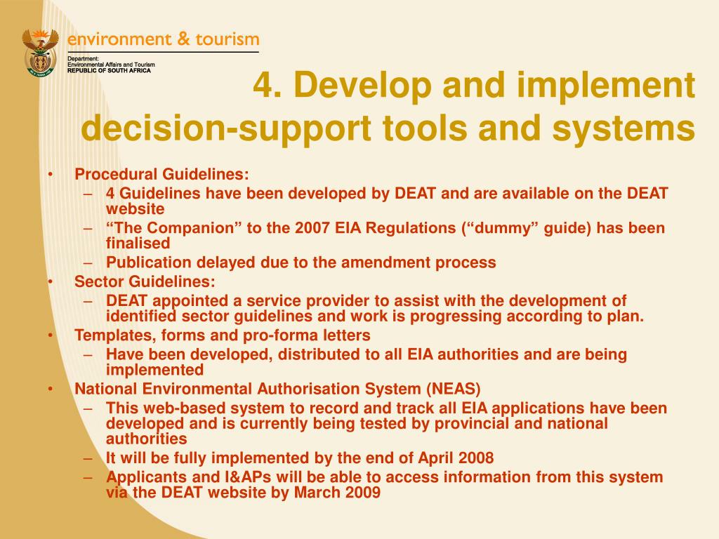 4. Develop and implement decision-support tools and systems • Procedural Guidelines: • 4 Guidelines have been developed by DEAT and are available on the DEAT website • “The Companion” to the 2007 EIA Regulations (“dummy” guide) has been finalised • Publication delayed due to the amendment process • Sector Guidelines: • DEAT appointed a service provider to assist with the development of identified sector guidelines and work is progressing according to plan. • Templates, forms and pro-forma letters • Have been developed, distributed to all EIA authorities and are being implemented • National Environmental Authorisation System (NEAS) • This web-based system to record and track all EIA applications have been developed and is currently being tested by provincial and national authorities • It will be fully implemented by the end of April 2008 • Applicants and I&APs will be able to access information from this system via the DEAT website by March 2009