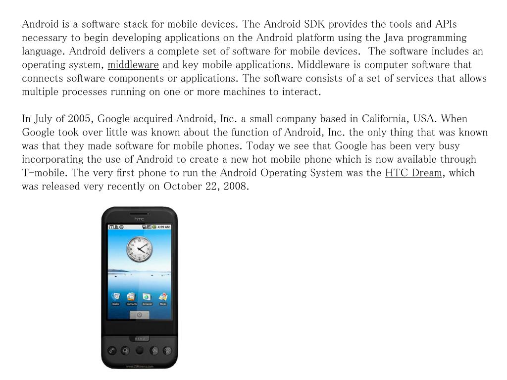 Android is a software stack for mobile devices. The Android SDK provides the tools and APIs necessary to begin developing applications on the Android platform using the Java programming language. Android delivers a complete set of software for mobile devices. The software includes an operating system, middleware and key mobile applications. Middleware is computer software that connects software components or applications. The software consists of a set of services that allows multiple processes running on one or more machines to interact. In July of 2005, Google acquired Android, Inc. a small company based in California, USA. When Google took over little was known about the function of Android, Inc. the only thing that was known was that they made software for mobile phones. Today we see that Google has been very busy incorporating the use of Android to create a new hot mobile phone which is now available through T-mobile. The very first phone to run the Android Operating System was the HTC Dream, which was released very recently on October 22, 2008.