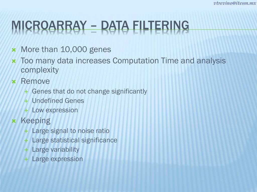 More than 10,000 genes • Too many data increases Computation Time and analysis complexity • Remove • Genes that do not change significantly • Undefined Genes • Low expression • Keeping • Large signal to noise ratio • Large statistical significance • Large variability • Large expression Microarray – Data Filtering