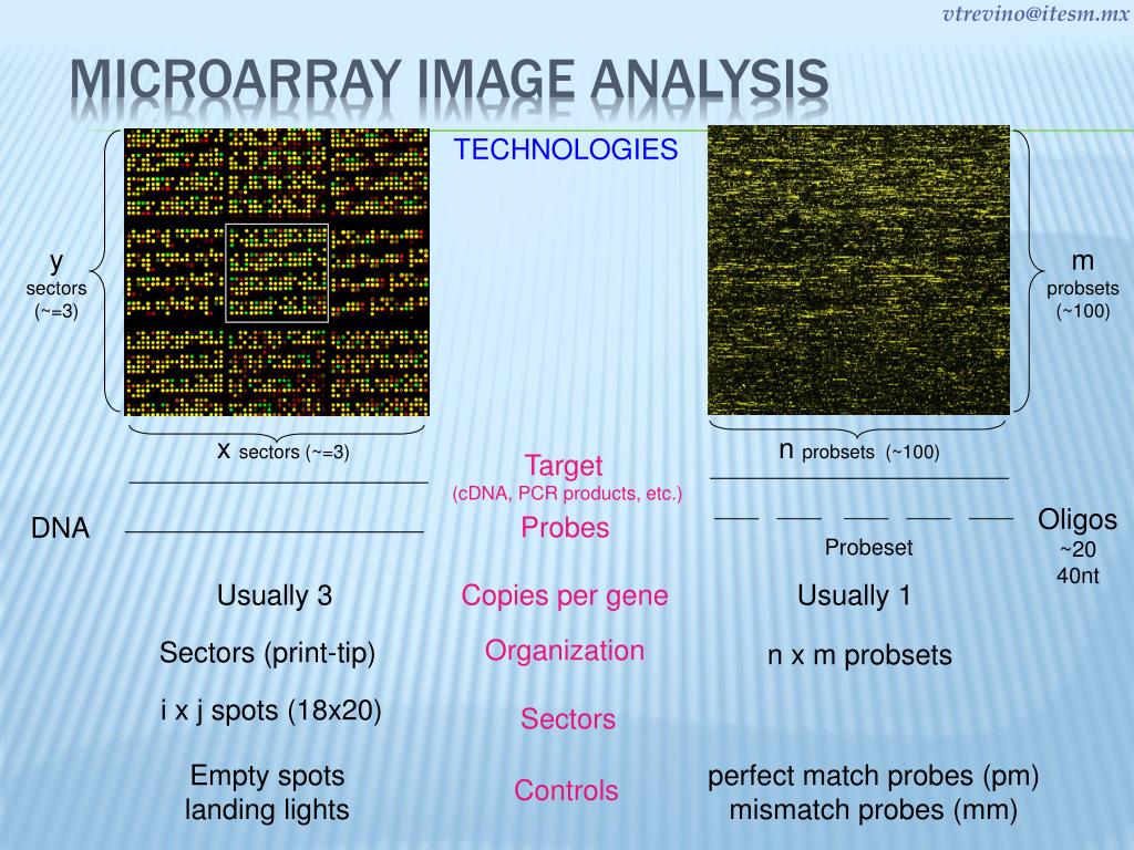 Microarray Image Analysis TECHNOLOGIES ysectors (~=3) mprobsets (~100) x sectors (~=3) n probsets (~100) Target (cDNA, PCR products, etc.) Oligos ~20 40nt Probes DNA Probeset Usually 3 Copies per gene Usually 1 Organization Sectors (print-tip) n x m probsets i x j spots (18x20) Sectors Empty spots landing lights perfect match probes (pm)mismatch probes (mm) Controls