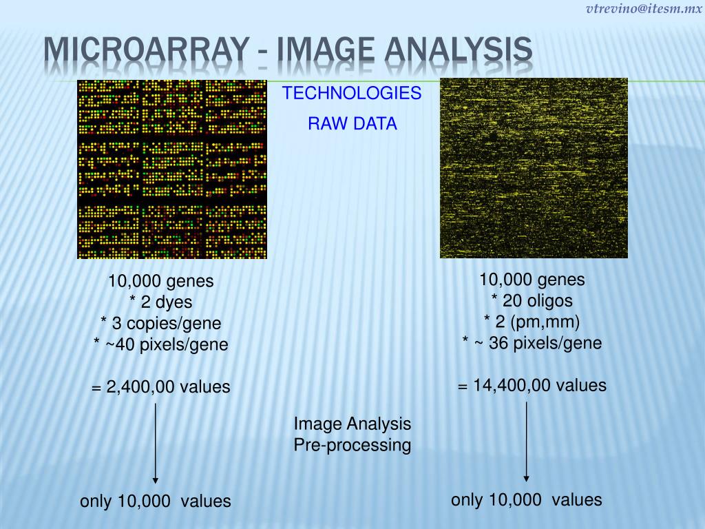 Microarray - Image Analysis TECHNOLOGIES RAW DATA 10,000 genes * 20 oligos * 2 (pm,mm) * ~ 36 pixels/gene = 14,400,00 values 10,000 genes * 2 dyes * 3 copies/gene * ~40 pixels/gene = 2,400,00 values Image Analysis Pre-processing only 10,000 values only 10,000 values