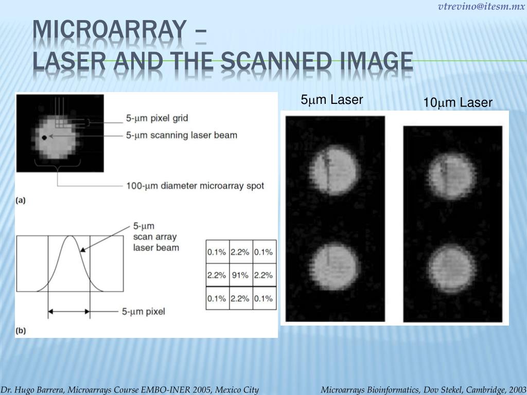 5m Laser 10m Laser Microarray – Laser and the Scanned Image Dr. Hugo Barrera, Microarrays Course EMBO-INER 2005, Mexico City Microarrays Bioinformatics, Dov Stekel, Cambridge, 2003