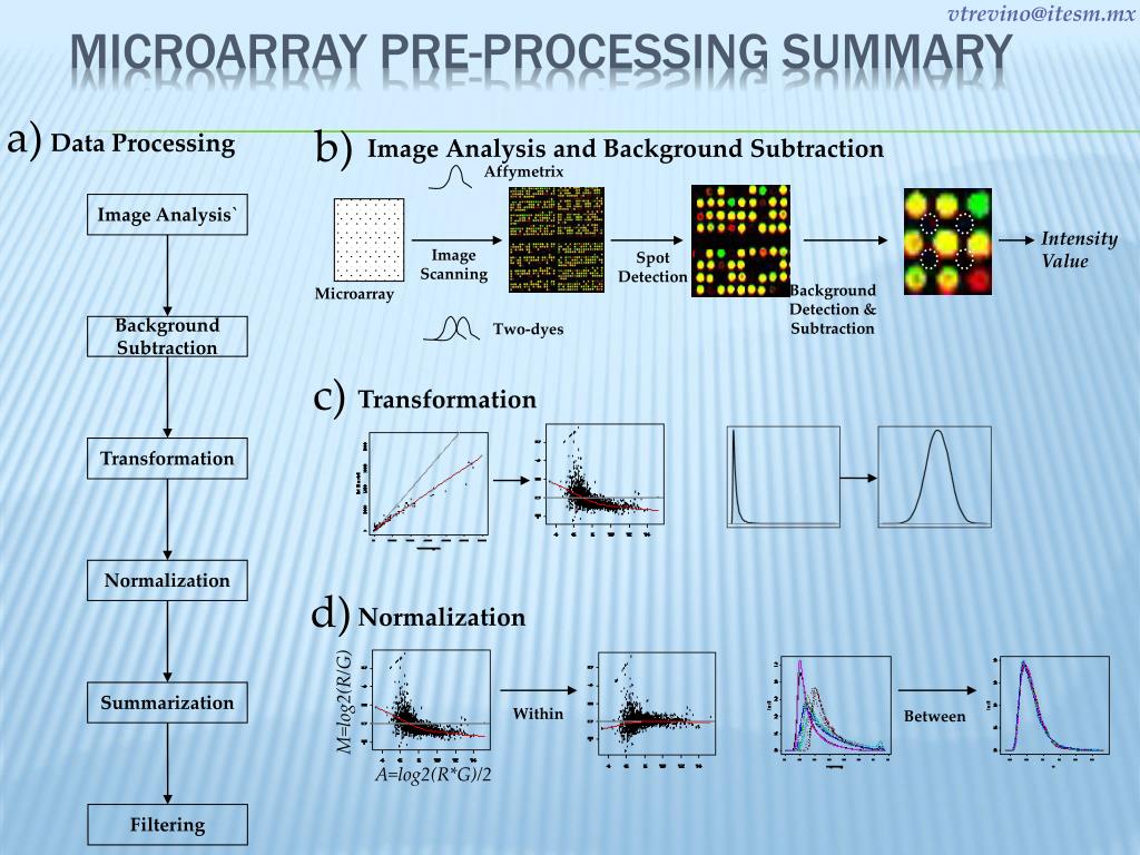 b) Image Analysis and Background Subtraction Affymetrix IntensityValue Image Scanning Spot Detection Microarray Two-dyes c) Transformation d) Normalization M=log2(R/G) Within Between A=log2(R*G)/2 Microarray Pre-Processing Summary a) Data Processing Image Analysis` Background Detection & Subtraction Background Subtraction Transformation Normalization Summarization Filtering