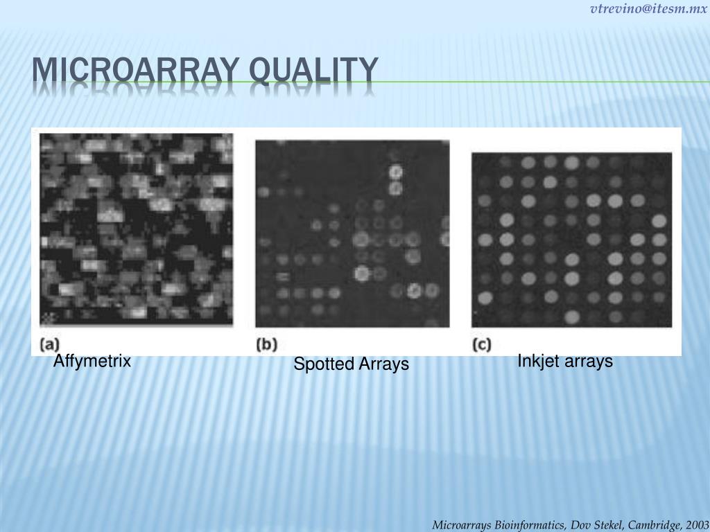 Microarray Quality Affymetrix Inkjet arrays Spotted Arrays Microarrays Bioinformatics, Dov Stekel, Cambridge, 2003