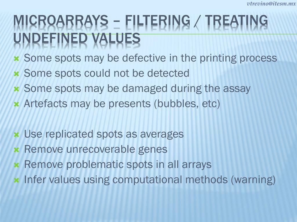 Some spots may be defective in the printing process Some spots could not be detected Some spots may be damaged during the assay Artefacts may be presents (bubbles, etc) Use replicated spots as averages Remove unrecoverable genes Remove problematic spots in all arrays Infer values using computational methods (warning) Microarrays – Filtering / Treating Undefined Values