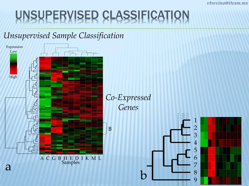 1 2 3 4 5 6 7 8 9 Unsupervised Classification Unsupervised Sample Classification Expression Low High Co-Expressed Genes B A C G B H E D I K M L Samples a b
