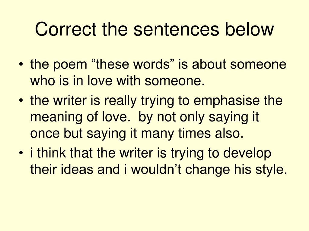 Correct the sentences below • the poem “these words” is about someone who is in love with someone. • the writer is really trying to emphasise the meaning of love. by not only saying it once but saying it many times also. • i think that the writer is trying to develop their ideas and i wouldn’t change his style.