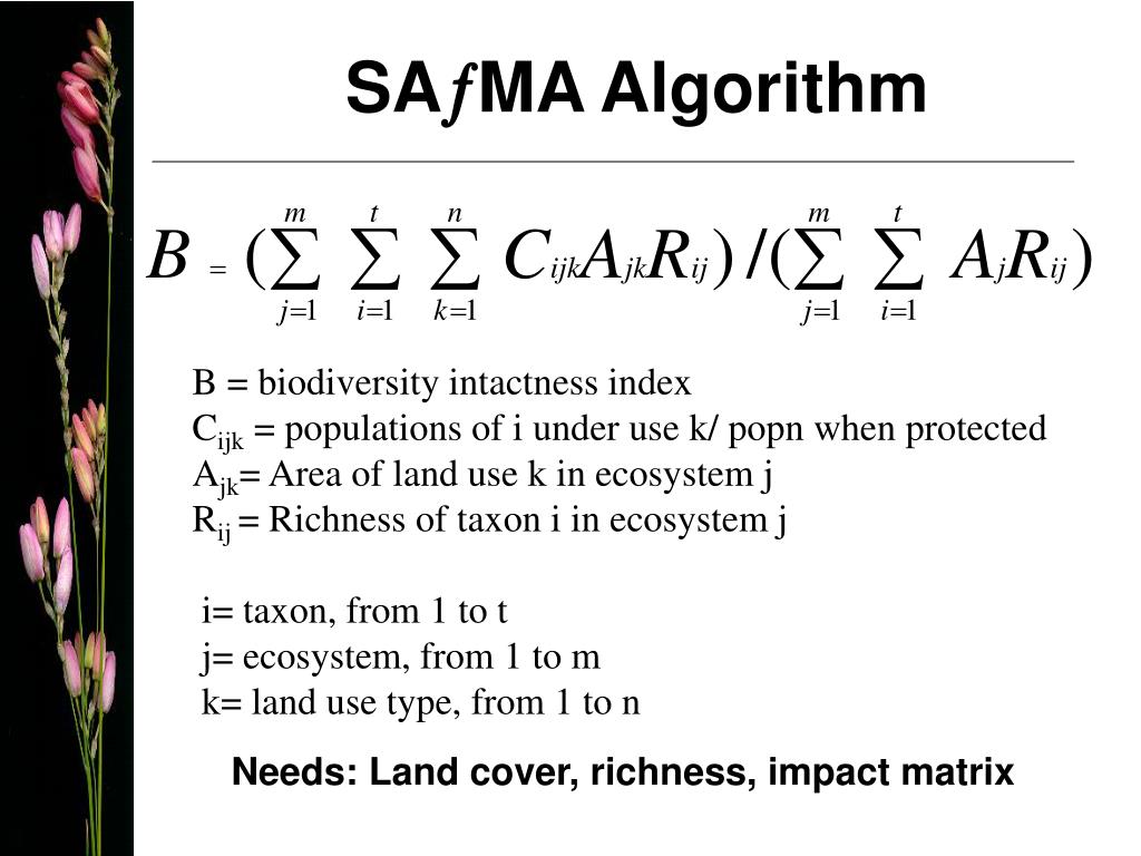 SAMA Algorithm B = biodiversity intactness index Cijk = populations of i under use k/ popn when protected Ajk= Area of land use k in ecosystem j Rij = Richness of taxon i in ecosystem j i= taxon, from 1 to t j= ecosystem, from 1 to m k= land use type, from 1 to n Needs: Land cover, richness, impact matrix