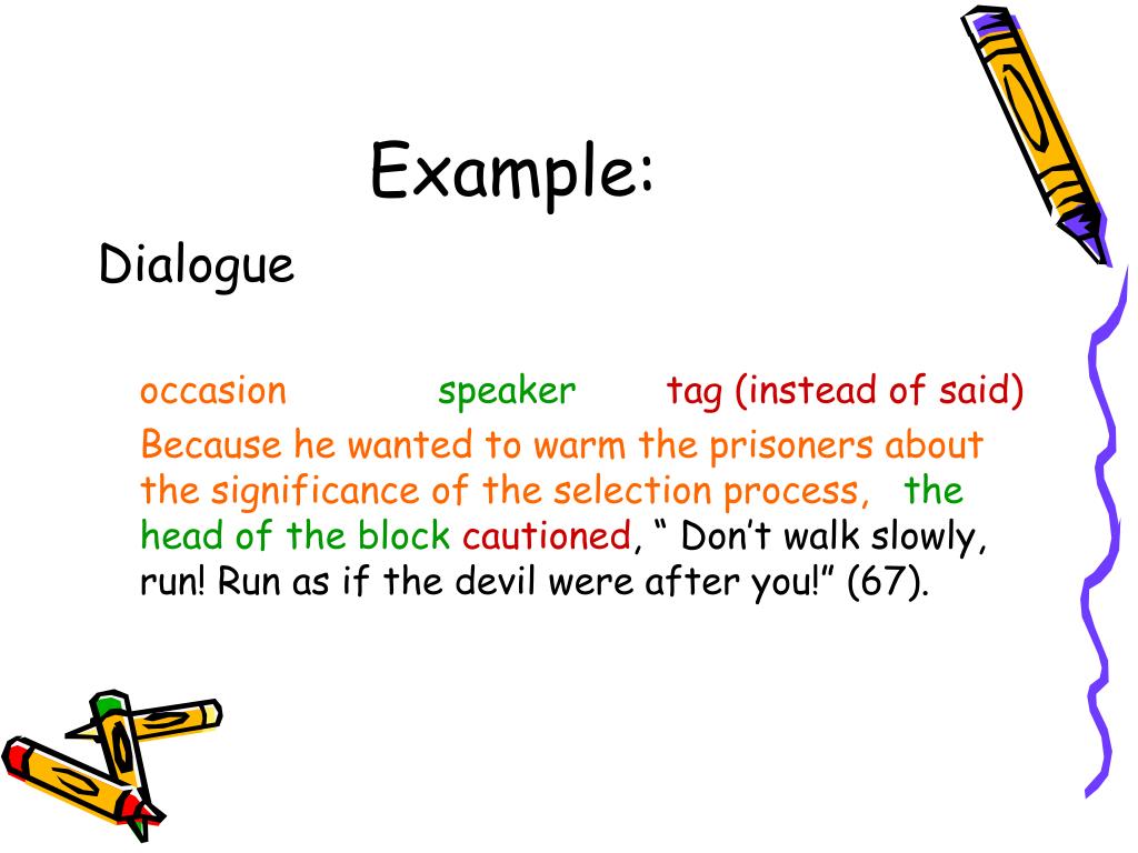 Example: Dialogue occasionspeakertag (instead of said) Because he wanted to warm the prisoners about the significance of the selection process, the head of the block cautioned, “ Don’t walk slowly, run! Run as if the devil were after you!” (67).