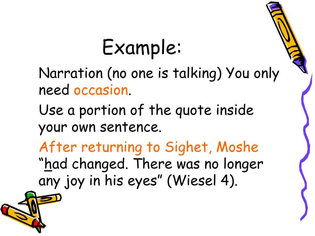 Example: Narration (no one is talking) You only need occasion. Use a portion of the quote inside your own sentence. After returning to Sighet, Moshe “had changed. There was no longer any joy in his eyes” (Wiesel 4).