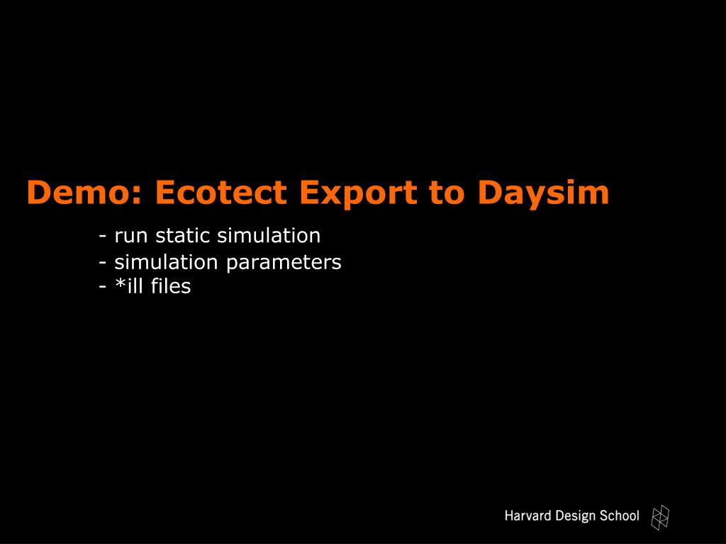 Demo: Ecotect Export to Daysim- run static simulation- simulation parameters- *ill files