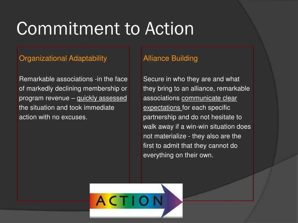 Commitment to Action Organizational Adaptability Remarkable associations -in the face of markedly declining membership or program revenue – quickly assessed the situation and took immediate action with no excuses. Alliance Building Secure in who they are and what they bring to an alliance, remarkable associations communicate clear expectations for each specific partnership and do not hesitate to walk away if a win-win situation does not materialize - they also are the first to admit that they cannot do everything on their own.