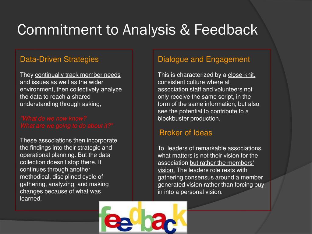 Commitment to Analysis & Feedback Data-Driven Strategies They continually track member needs and issues as well as the wider environment, then collectively analyze the data to reach a shared understanding through asking, "What do we now know? What are we going to do about it?" These associations then incorporate the findings into their strategic and operational planning. But the data collection doesn't stop there. It continues through another methodical, disciplined cycle of gathering, analyzing, and making changes because of what was learned. Dialogue and Engagement This is characterized by a close-knit, consistent culture where all association staff and volunteers not only receive the same script, in the form of the same information, but also see the potential to contribute to a blockbuster production. Broker of Ideas To leaders of remarkable associations, what matters is not their vision for the association but rather the members‘ vision. The leaders role rests with gathering consensus around a member generated vision rather than forcing buy in into a personal vision.