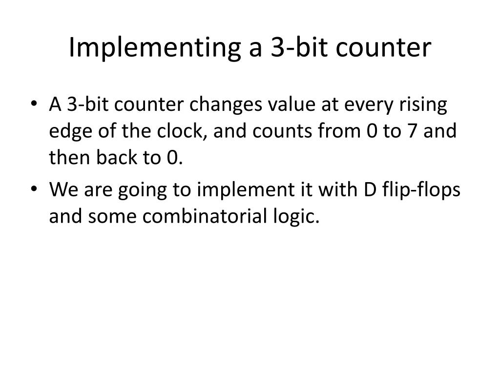 Implementing a 3-bit counter • A 3-bit counter changes value at every rising edge of the clock, and counts from 0 to 7 and then back to 0. • We are going to implement it with D flip-flops and some combinatorial logic.